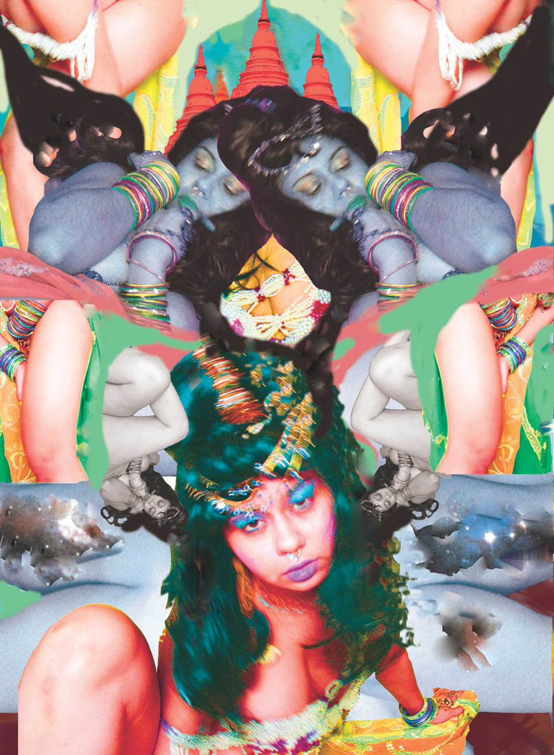 “As a kid I was always devoted to being creative,” says Indrani, who started focusing on art as a teenager, drawn to its interdisciplinary nature and the sense of independence it offered. Working initially with installation, Ashe later integrated elements of performance, video and collage. Never wanting to limit herself to just one medium, she enjoys the challenge of working across many. “My work is about the body, the body as a home for an individual: how it connects or doesn’t connect to others, belongs or doesn’t belong, how it moves along in systems of gender, money, and status,” reflects the artist. Currently based in Berlin, Germany, she works from a desk or simple work table. Often, her greatest artistic challenge is finding time and money to work with. She is in the midst of producing a 4-channel video installation about her alter ego, Goddess and Psychedelic Pin up Artist, Sadette Delacroix. She’s also working on a collaborative project about “the morbidity of the European cultural superiority complex,” what will be “a humorous combination of performance, photography, and video,” says Indrani.